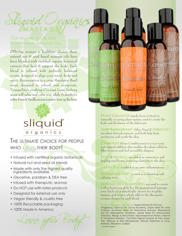 Sliquid產品的天然成份配方,讓您感覺不到它的存在,帶有絲絲香味,滋潤著每一寸肌膚。